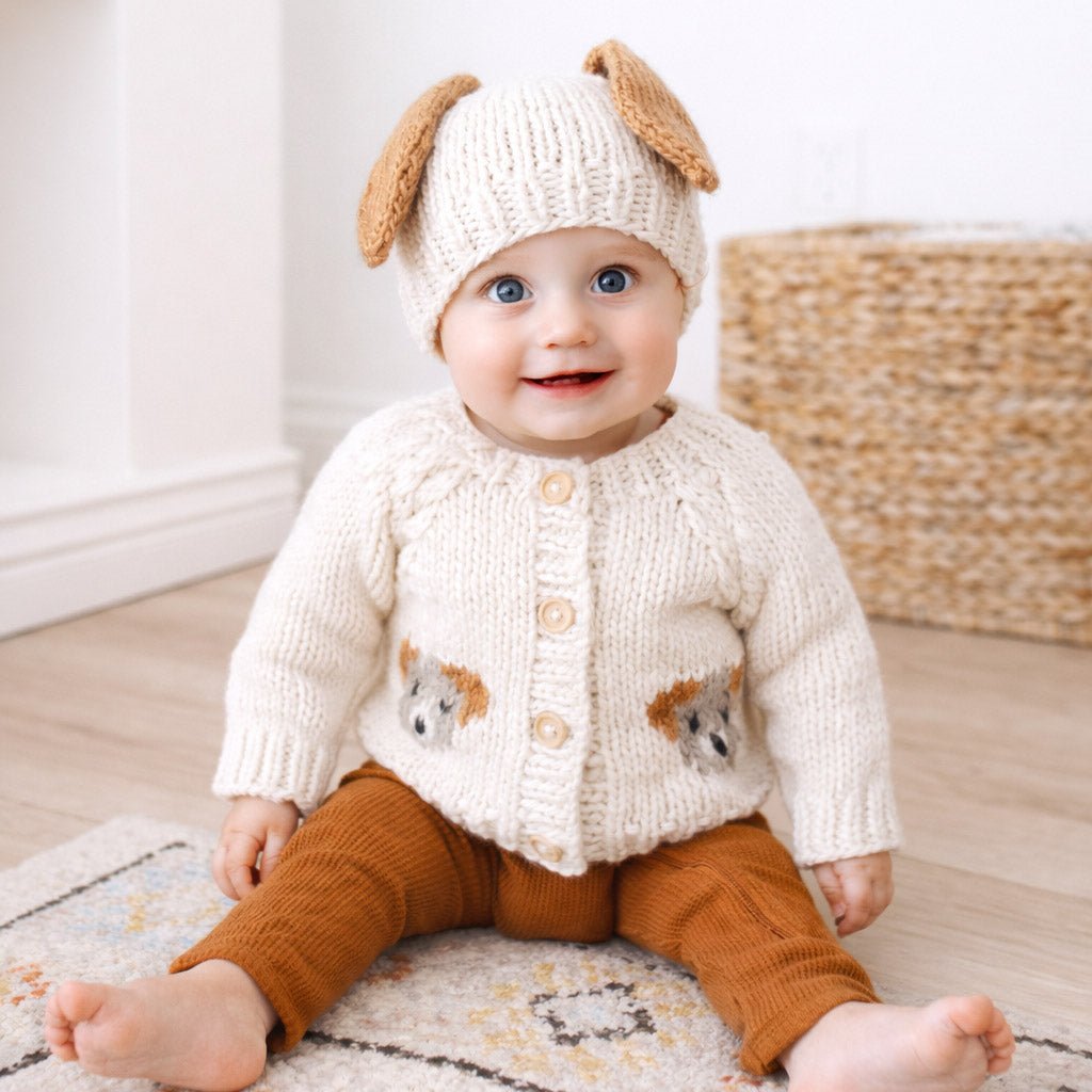 This adorable Puppy Cardigan Sweater is perfect for those who adore puppies! Hand-knitted with natural hued yarn, it features two cute puppy faces on the front. The raglan sleeves are beautifully accented with cables, while the natural wood buttons add a charming touch. For a complete and matching look, pair it with our Puppy Beanie hat, available separately.